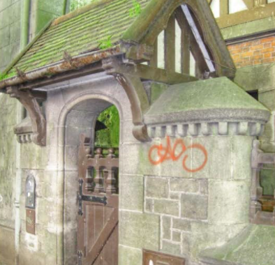 El patio exterior está cercado por un muro de piedra que presenta en sus accesos vehiculares por ambas calles (tranqueras de madera), pilares en forma de pequeñas torres, realizadas en piedra martelinada.